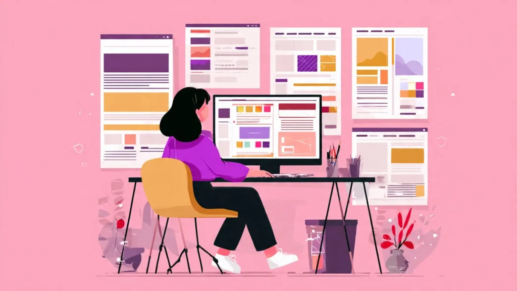 A friendly person sitting at a desk with a laptop, surrounded by icons of WordPress, hosting, domain, and website layouts, in a bright modern workspace — 3D flat illustration style.