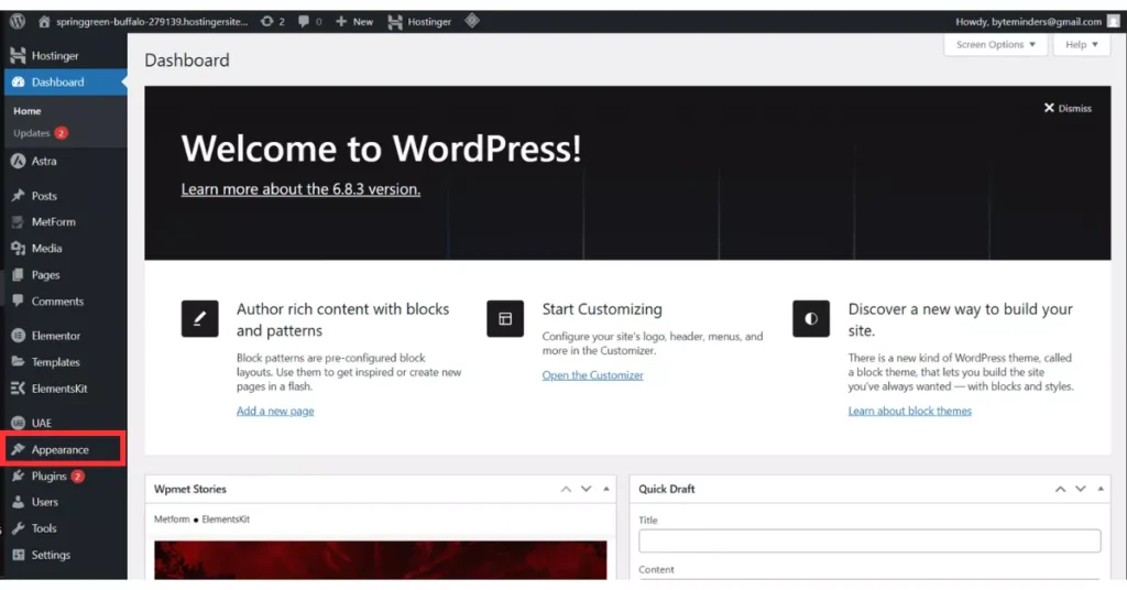 Think of the WordPress Dashboard as the control room of your entire website. Everything — from creating posts, uploading images, changing the site design, approving comments, and installing plugins — happens here.